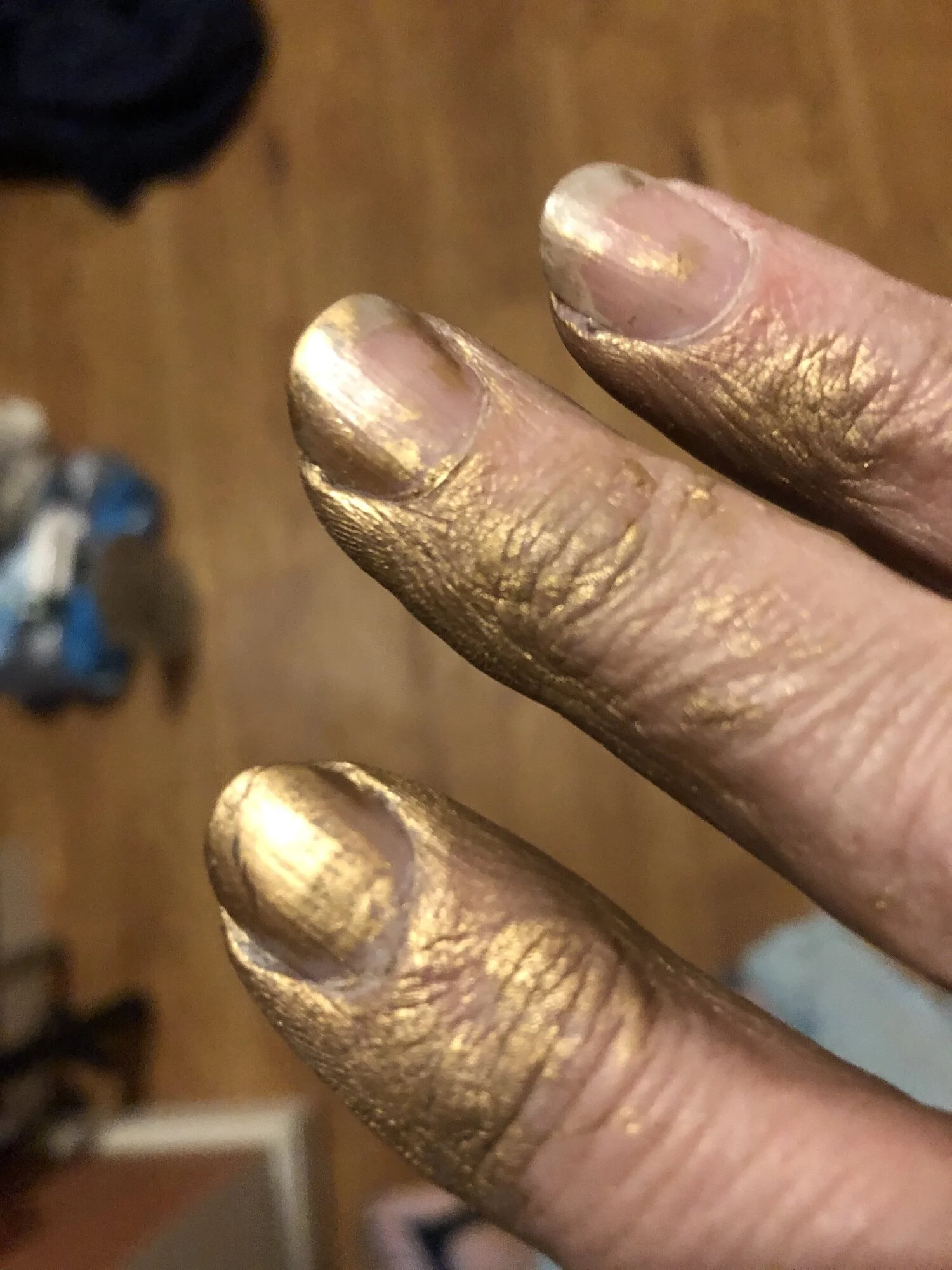 Rub ‘n Buff makes the magic happen, but at the price of gold fingers! It comes in a variety of metallics, and even some colors.