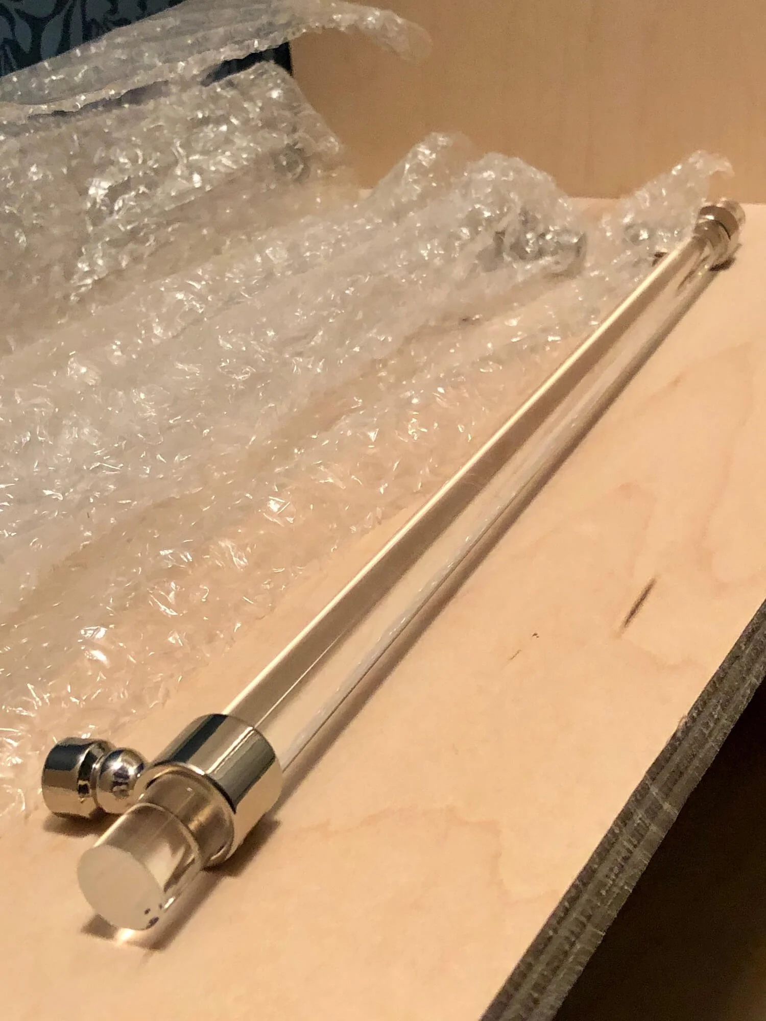 And the most recent arrival was our handles for the closet drawers. I wanted lucite and silver toned drawer pulls and I wanted them long because the drawers are almost 30” wide and I didn’t want to have two handles that would require two hands to operate. I was so delighted when I found these beauties that are 14” long on Etsy!! I ordered them with expedited shipping and they arrived in just 4 days! And they were extremely well packaged with multiple layers of bubble wrap.