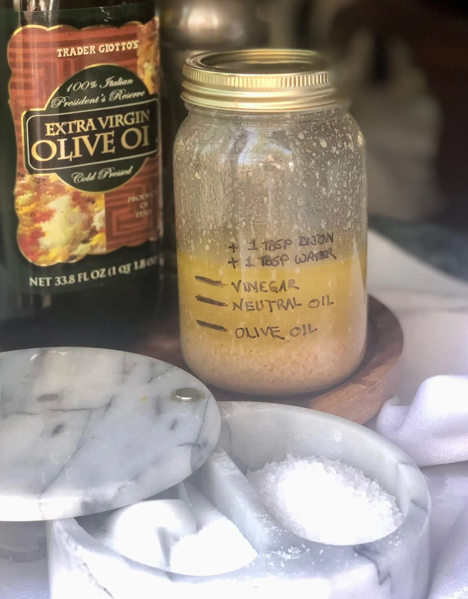 That’s it! The basic premise is 3 parts fat to 1 part acid, with some mustard thrown in to help with emulsion and add a bit of sweet zing.