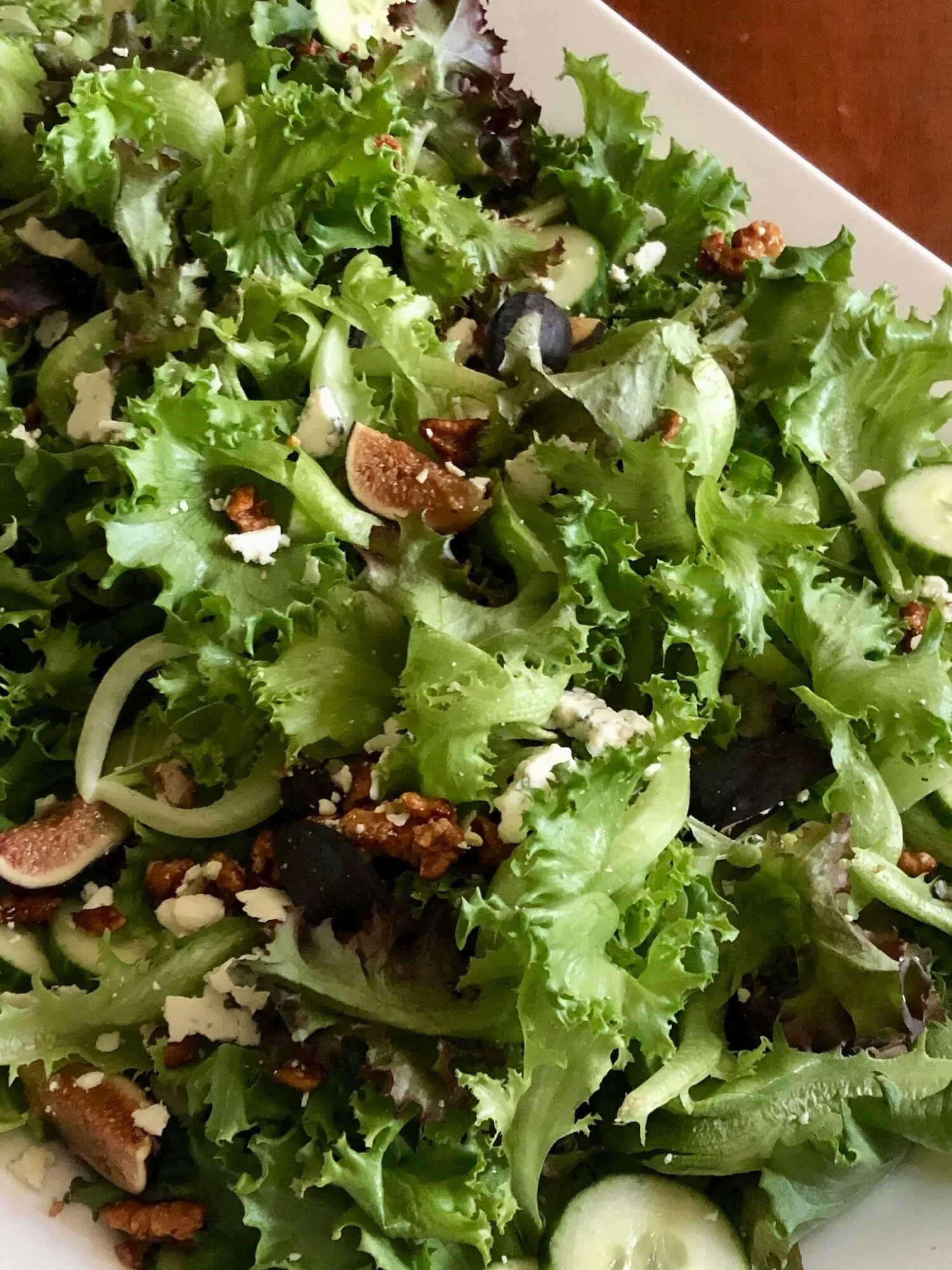 Simple salad, well dressed can be wonderful on its own, but you can level up any salad with the addition of fresh or dried fruit, crumbled, grated, or cubed cheese, and toasted or sugared nuts. Add a protein like shrimp or scallops, or chicken and it is a perfect, flavor balanced, and nutritious meal.