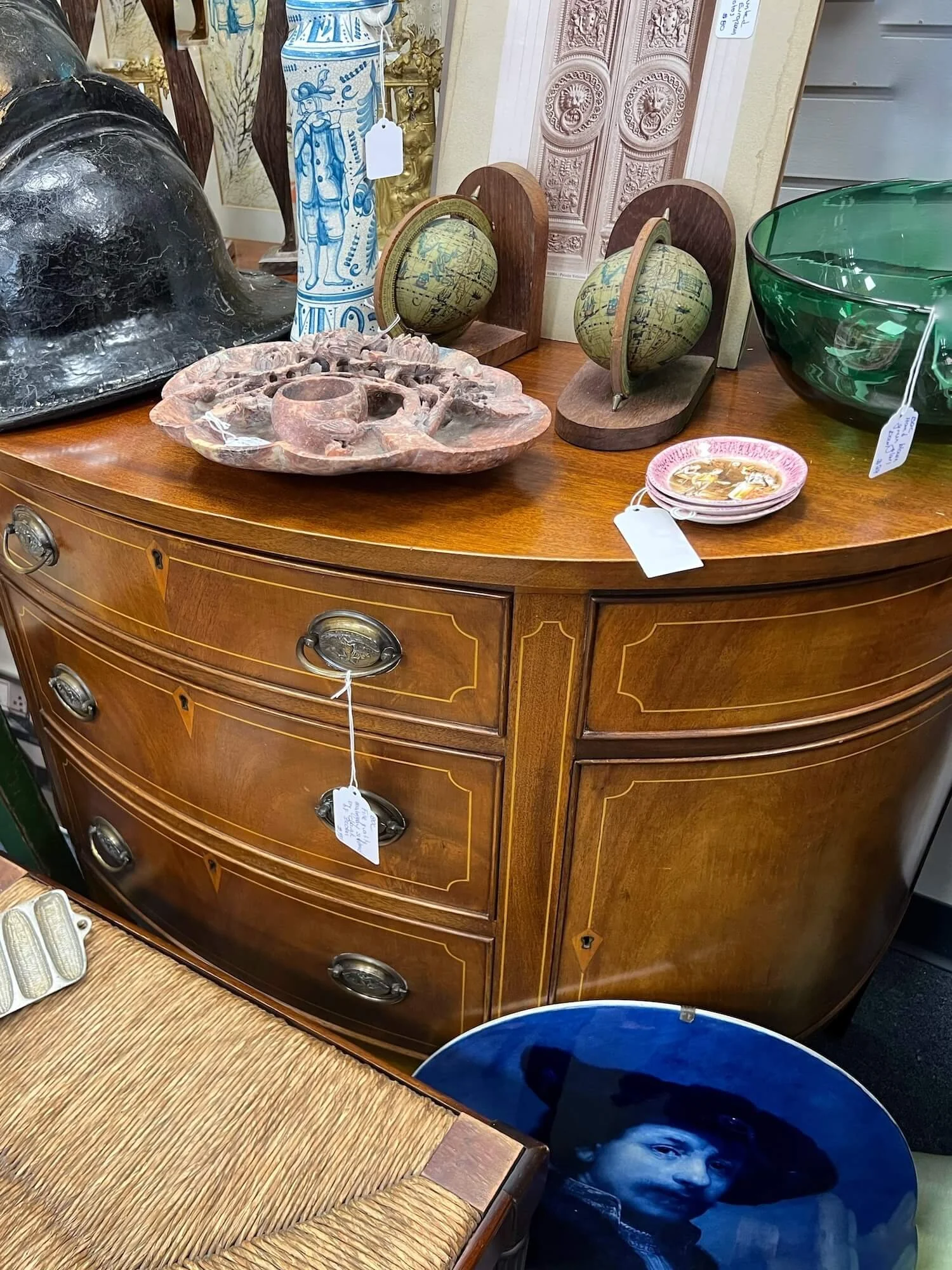 I came across this beautiful demilune Hepplewhite style chest handmade by Charak Furniture in Boston, a company known for fine reproductions in the early 20th century buried under a bunch of stuff in the back of a booth at my local vintage shop yesterday. The chest was numbered and dated 1931! If I had ANYPLACE in my home whee I could put this, I would have scooped it up.