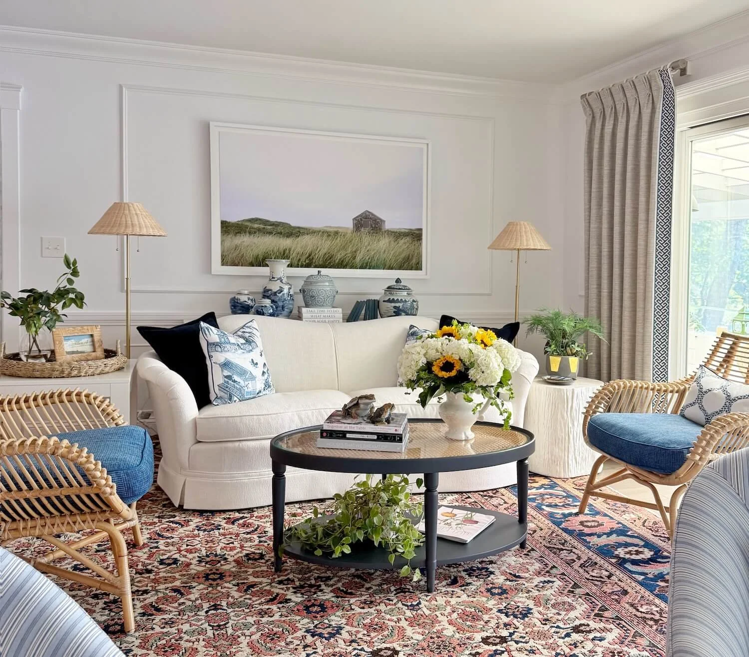 A new cane topped painted oval coffee table fits the curve of the sofa and adds color and texture to the grouping. Newly covered cushions on the remaining bamboo chairs add a jolt of blue.