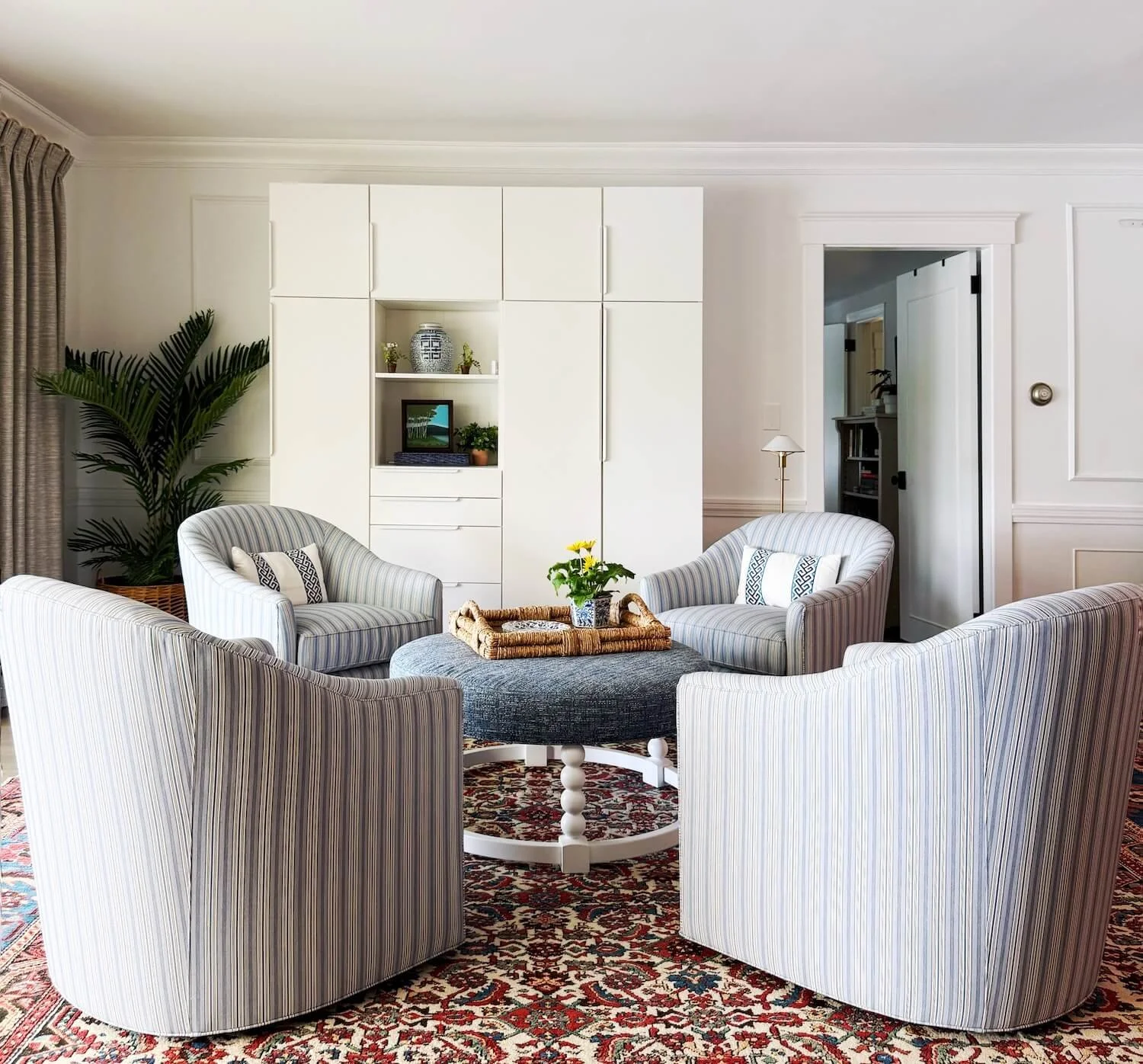 The rattan sofa, 4 wicker chairs, and round marble tabletop were all repurposed on the porch and replaced with an inviting down sofa covered in a creamy chenille, four new upholstered swivel chairs in a smart stripe, and a large ottoman.
