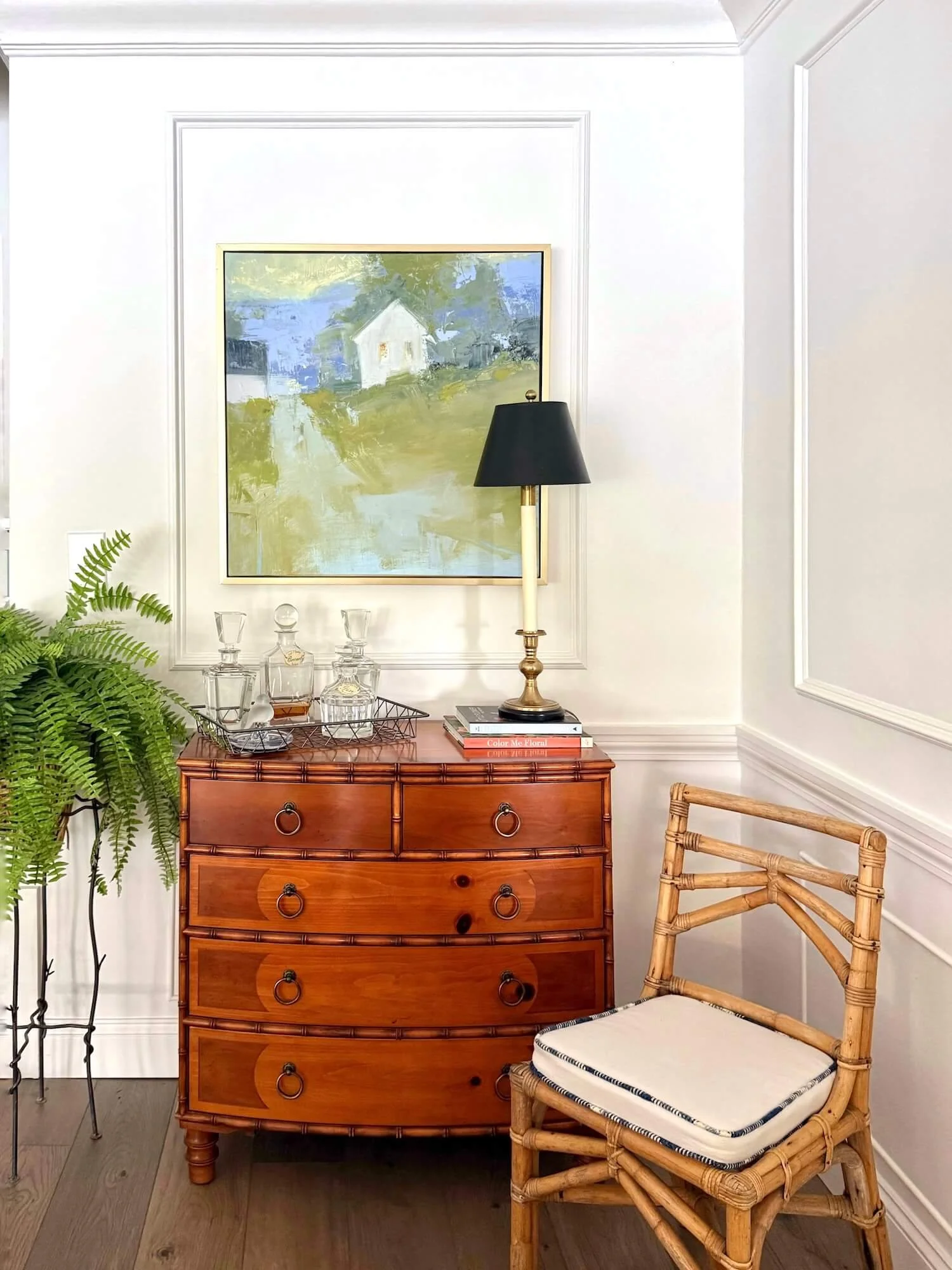 Again there was lovely artwork here already and custom curtain panels at the ends of the window wall. A large inherited oriental rug covered the floor, and there was a console table, large storage piece, some interesting side tables and bamboo chairs we could reuse.