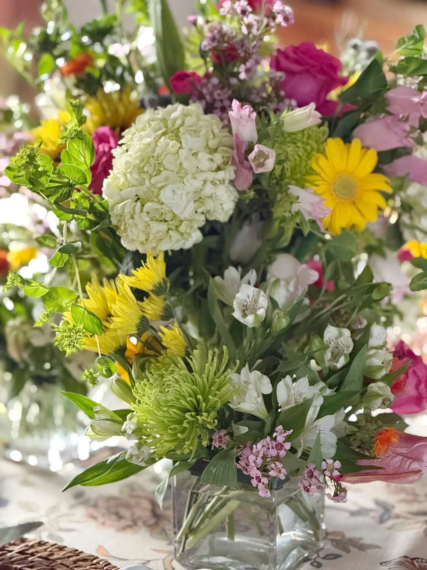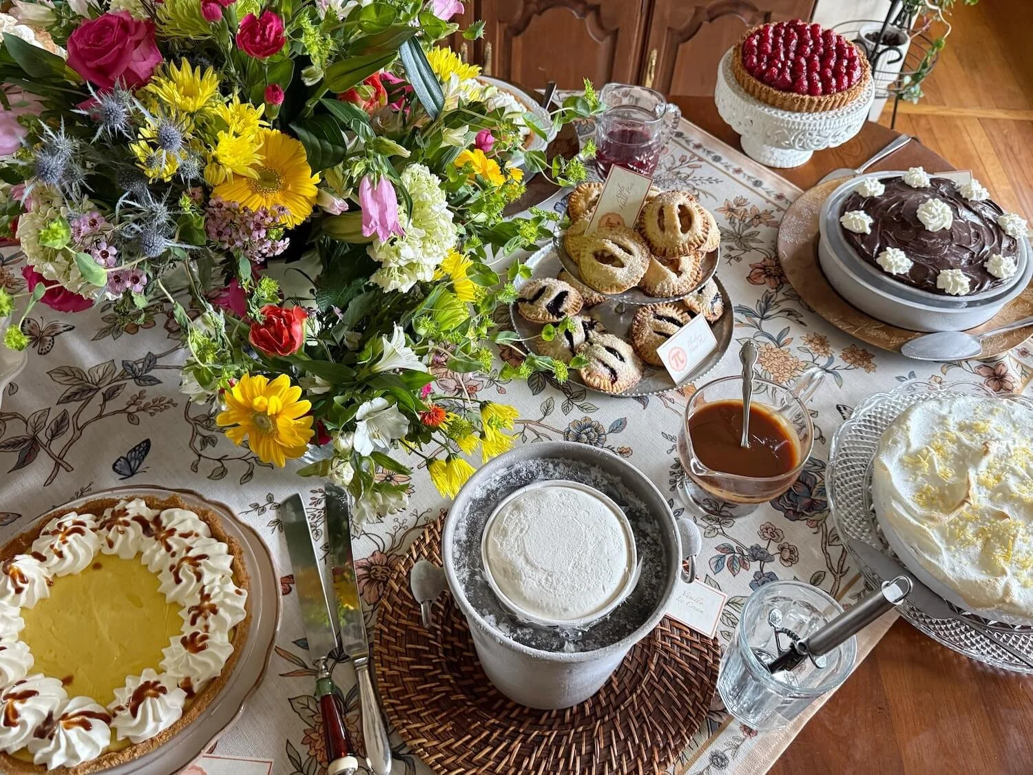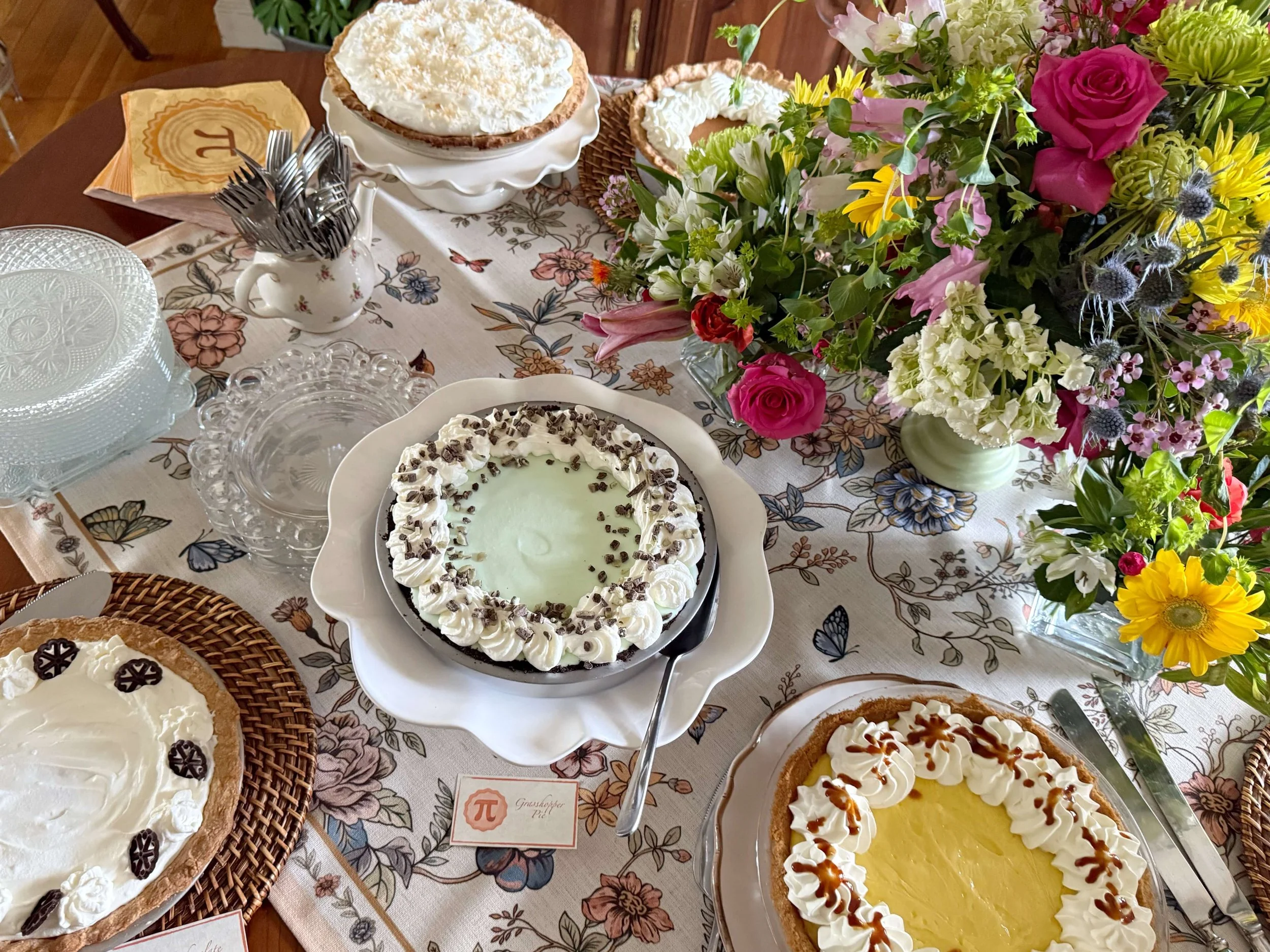 The table was set with our new spring tablecloth and pi day napkins and a centerpiece comprised of assorted spring colored flowers in one standard and 3 shorter vases.