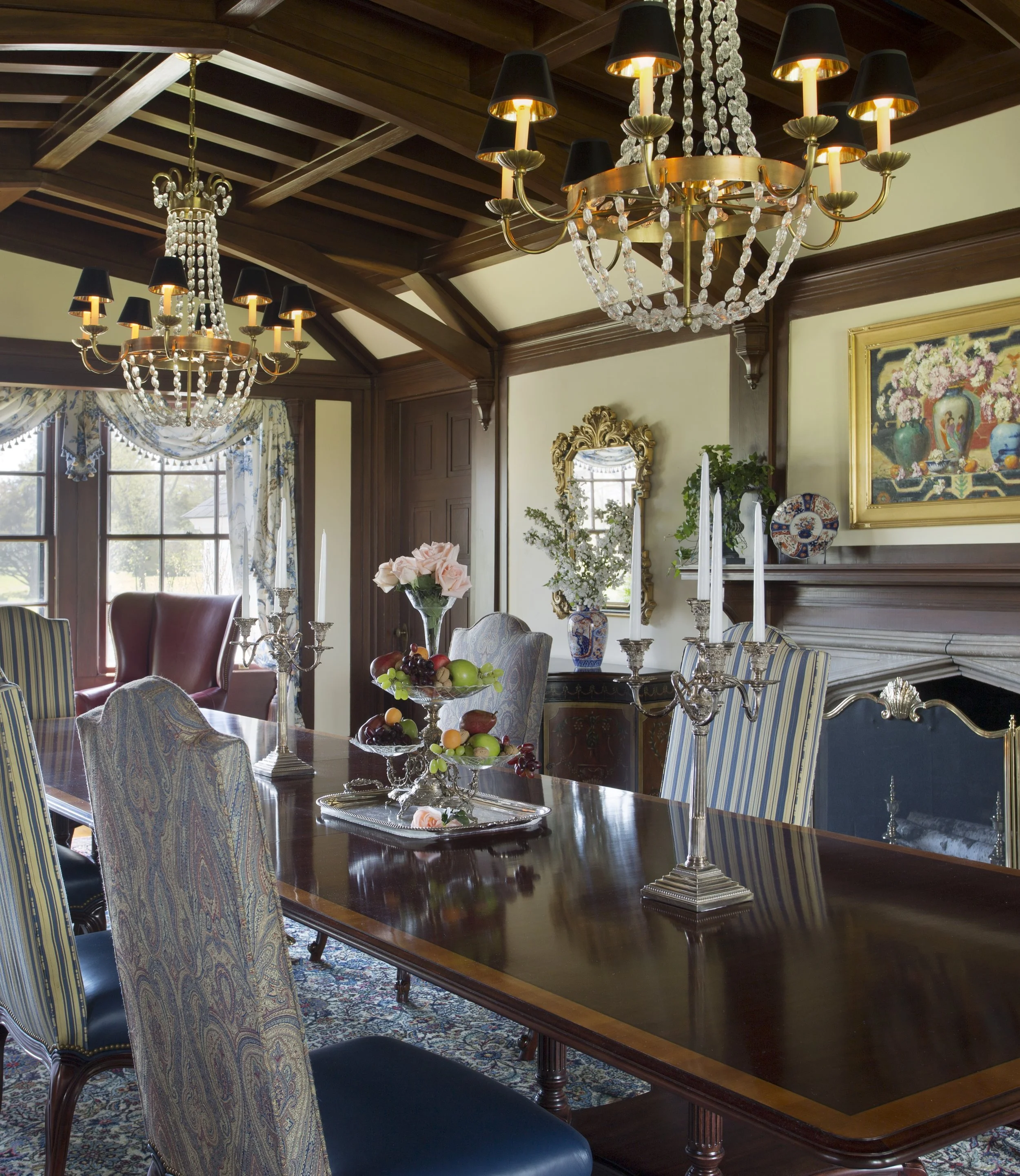 In this grandly scaled dining room, we used two Paris flea market style chandeliers over the table which extends from sixteen to twenty feet. The higher ceiling and overall scale of the room called for hanging them slightly higher.
