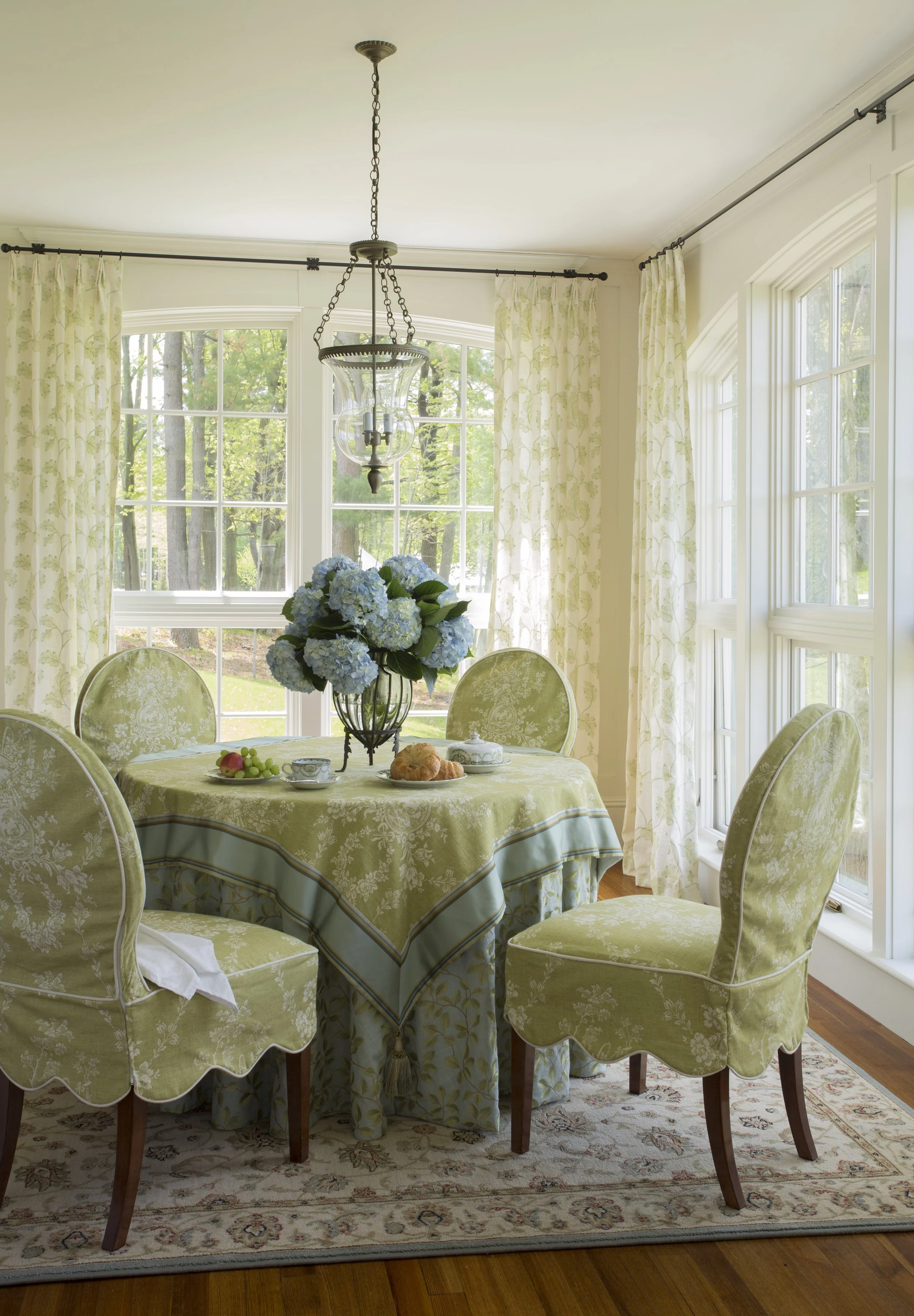 This bell jar fixture is the perfect style for this sunroom corner dining spot.