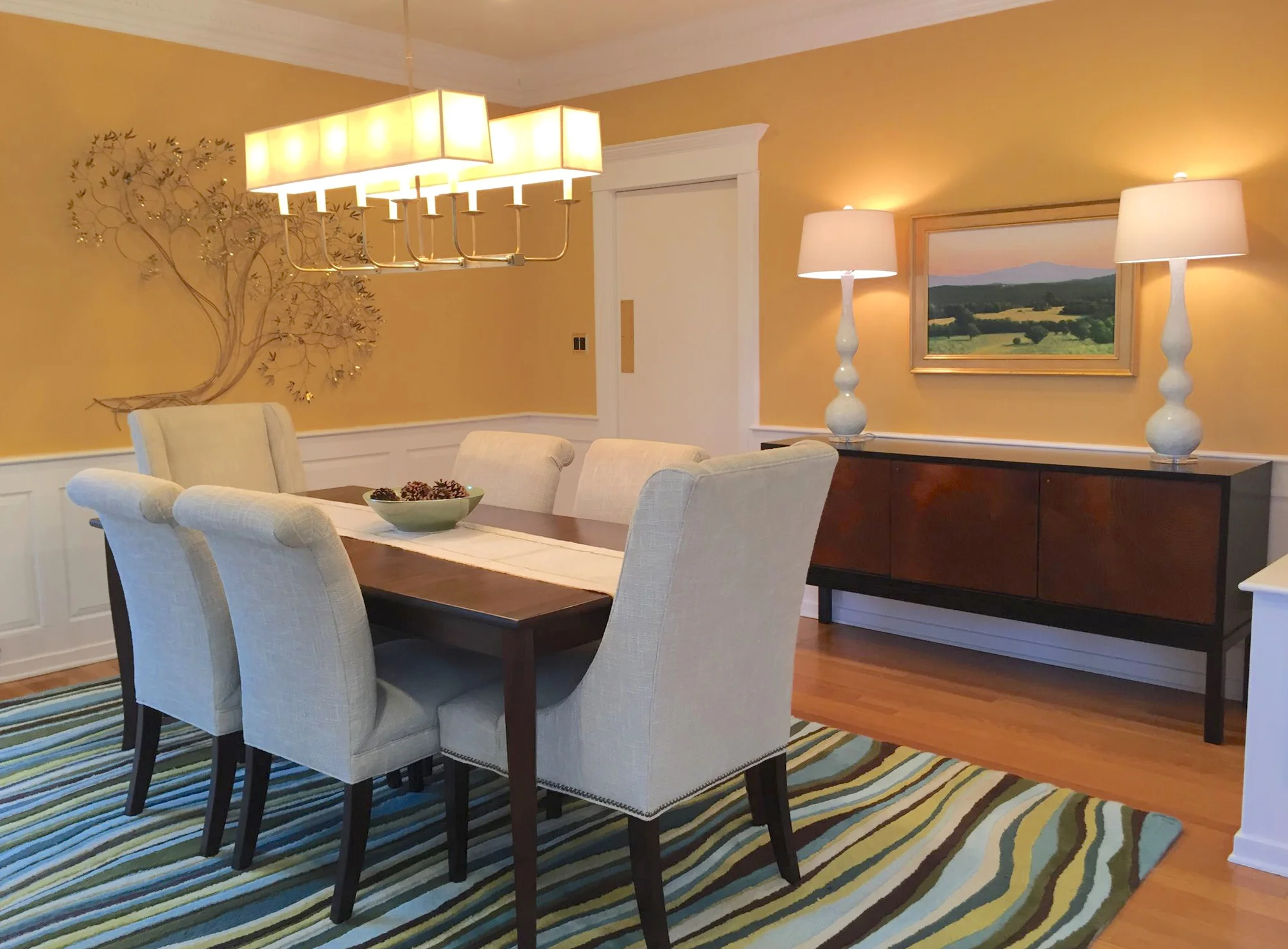 This rectangular 10-arm chandelier works beautifully with both the scale of the room and style of the furnishings. The visual weight of the chandelier is mostly in the shades at the top of the fixture, so it is hung slightly lower than would normally be called for with this nine foot ceiling.