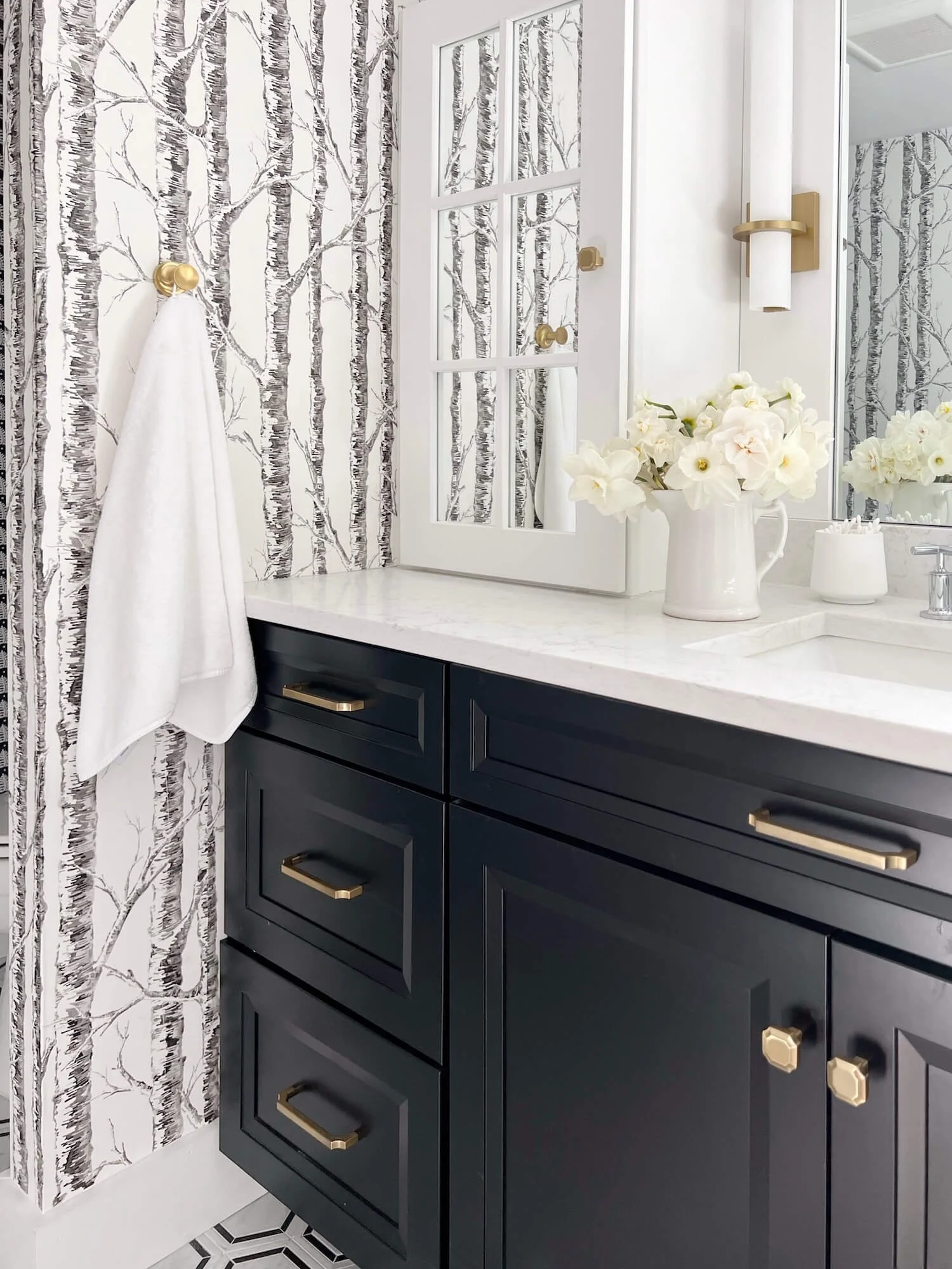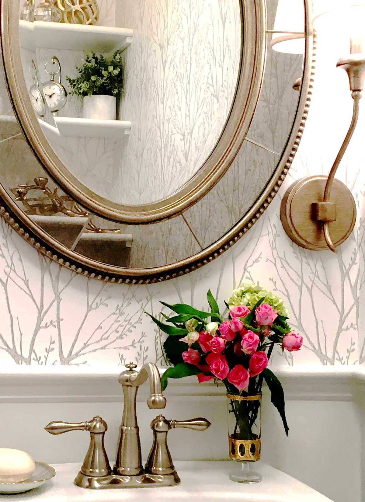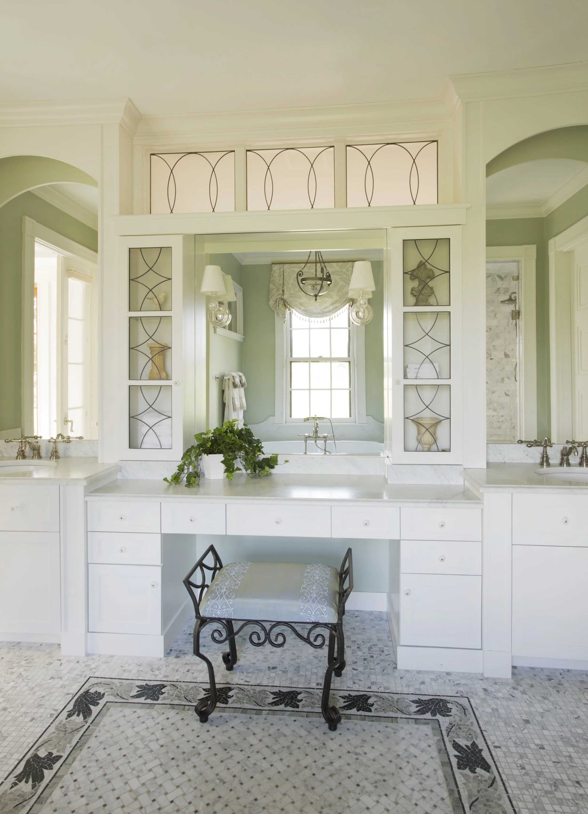 Custom millwork was designed to mount this light fixture over the mirror in this classic bathroom renovation. Design by JRL Interiors