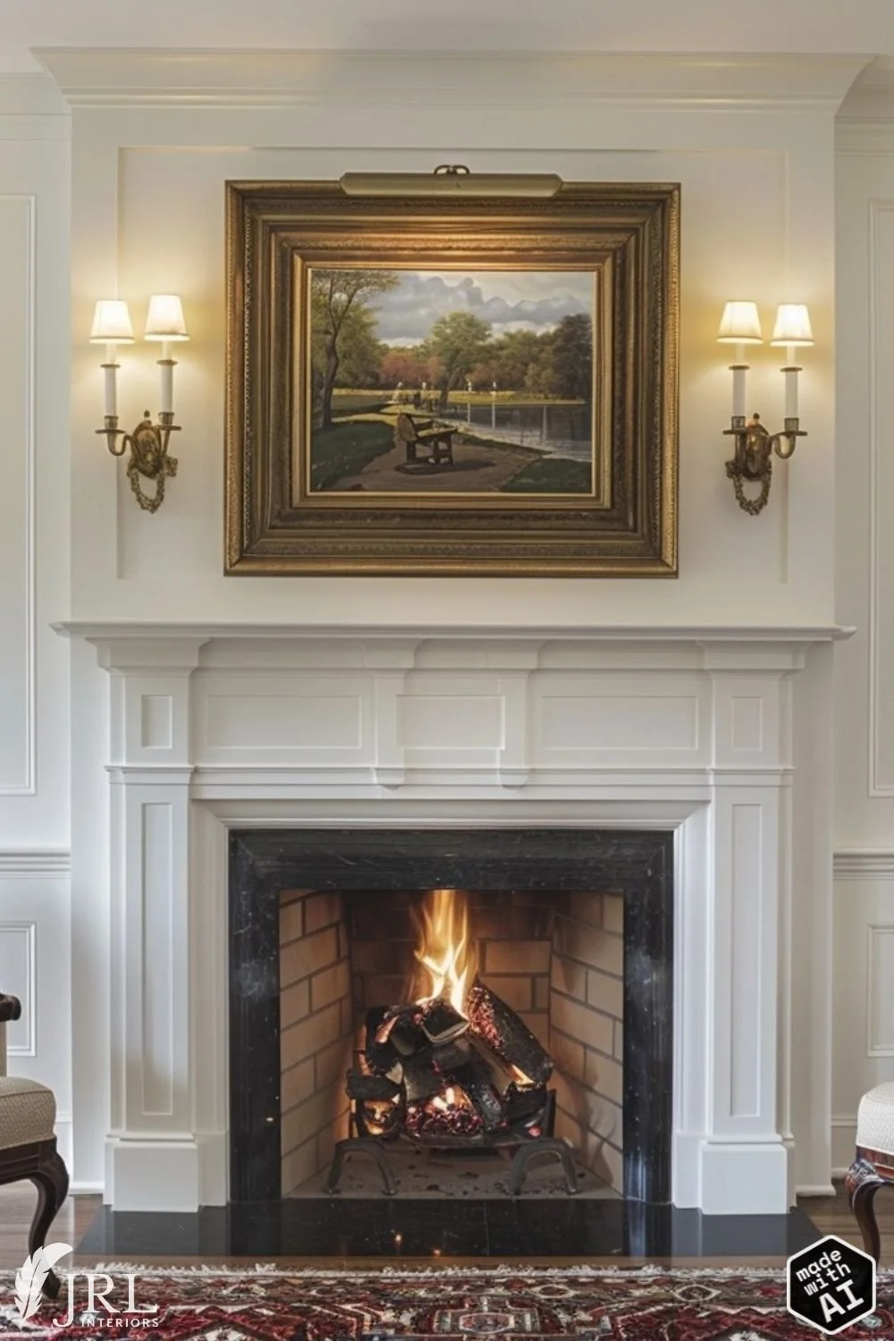 Sconces over a fireplace mantel will depend on the size of the mantel and ceiling height, but in a house with standard 8’ ceilings or lower, halfway between the top of the mantel and the ceiling is usually a good height.